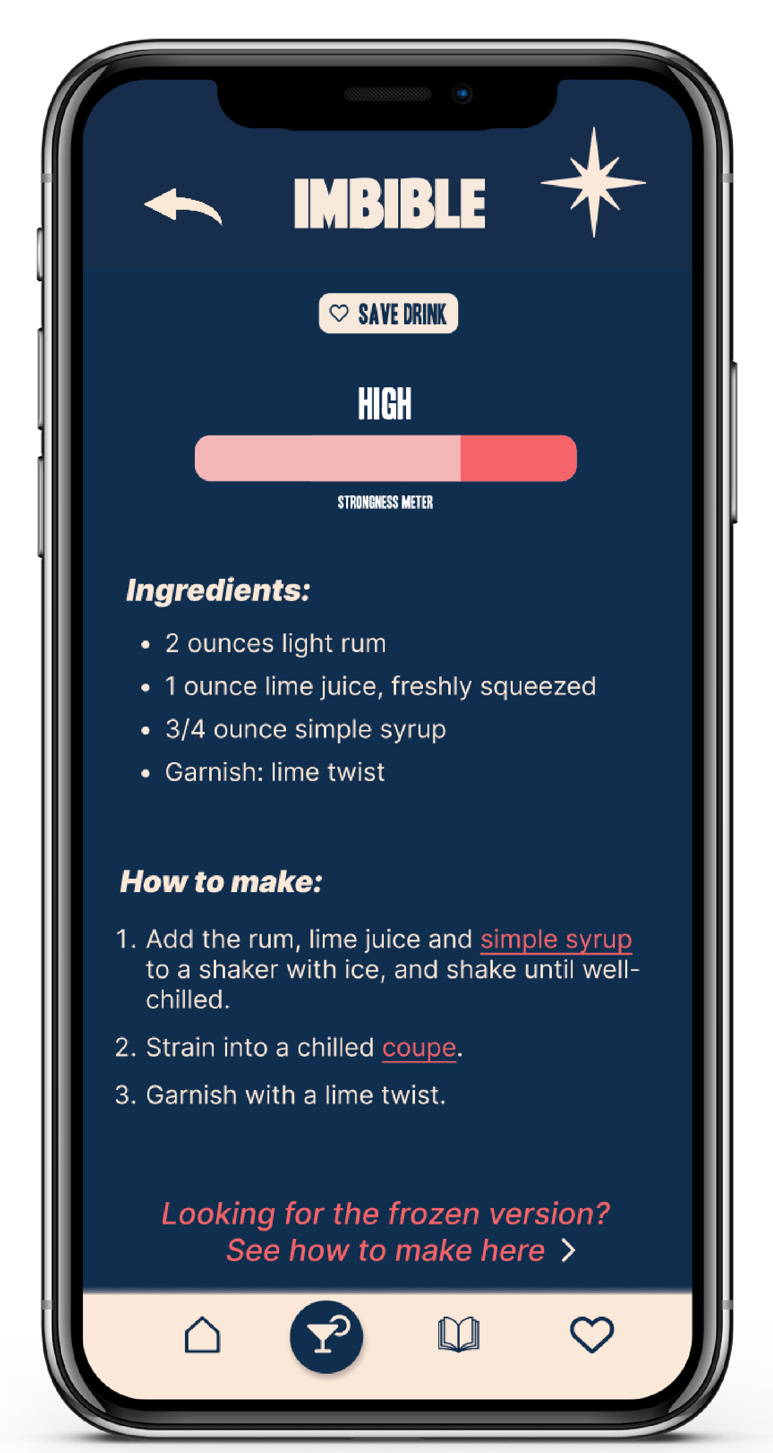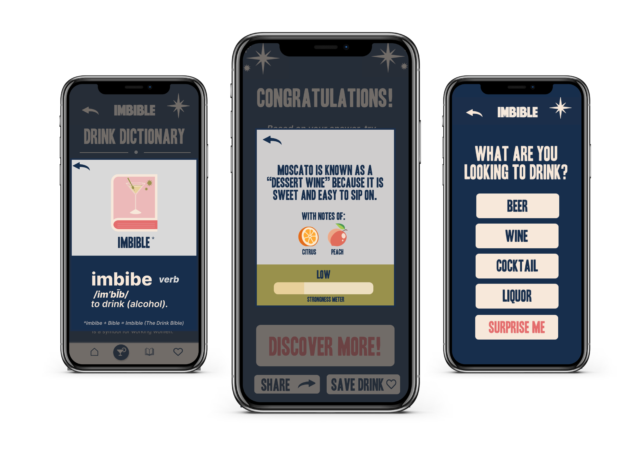 As mentioned above, the prototype developed for this project is called Imbible, an app intended to educate college-aged adults about drinks: what they mean, what’s in them, what to get, and how to order it.
