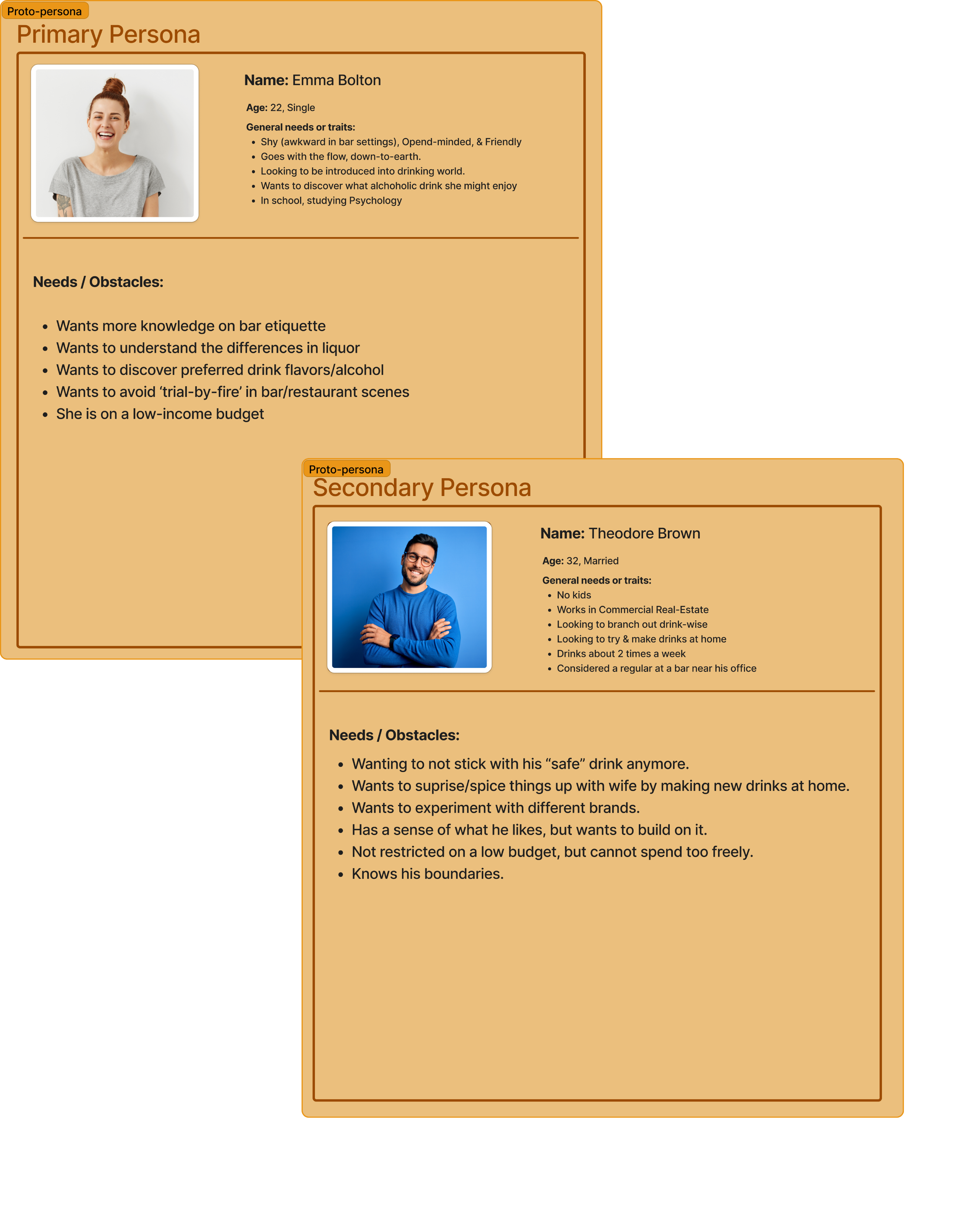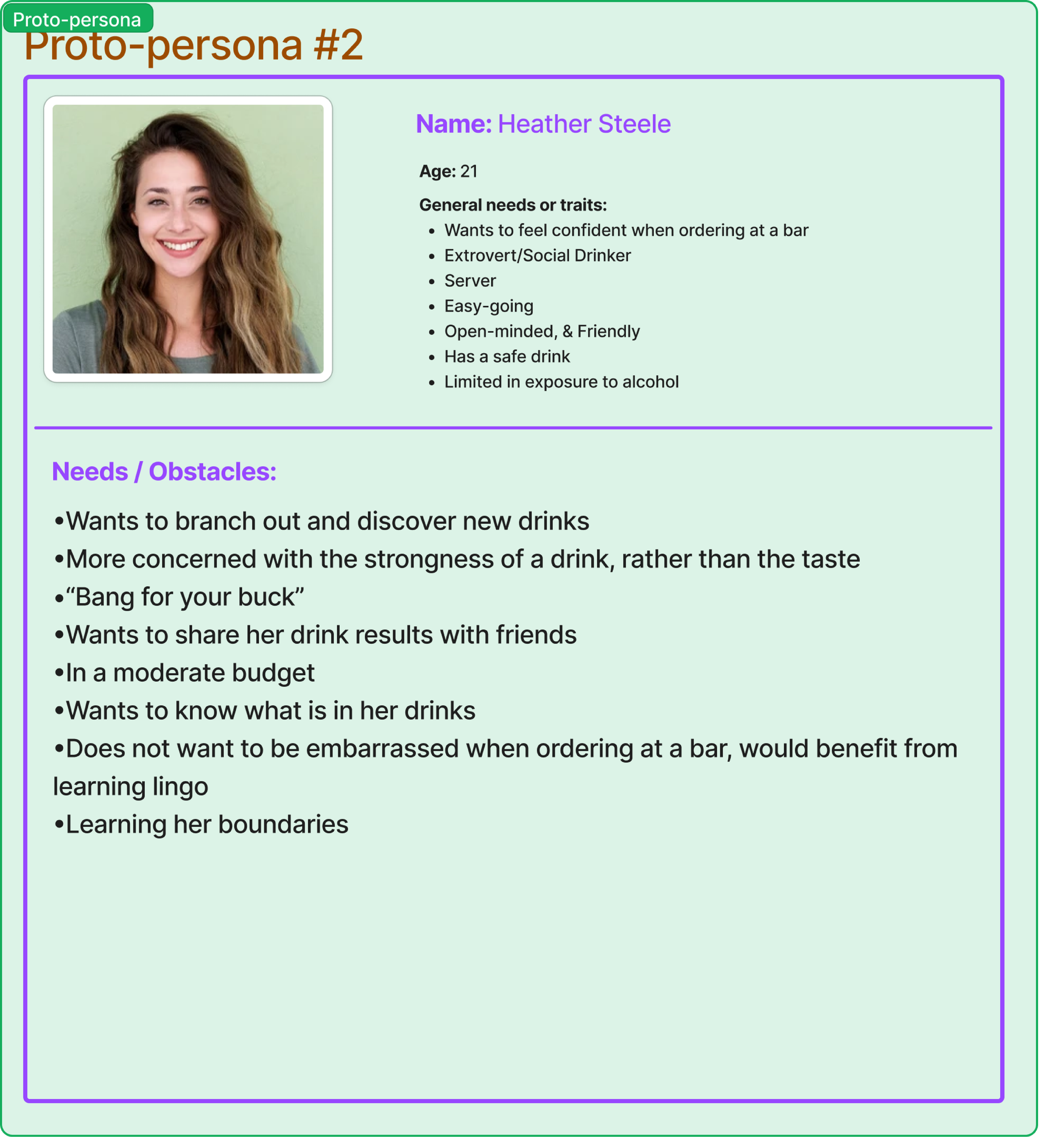 This insight helped us make changes to improve our proto-persona. When we originally thought we had two main audiences, we realized that most of the audience can be grouped into one category, so our secondary persona was removed. Our new proto-persona was adapted to what we found from our interviewees: the user wanted to be able to share drink ideas with friends, educate herself on bar lingo so as not to be “embarrassed,” and to browse/discover drinks without needing to take the quiz.
