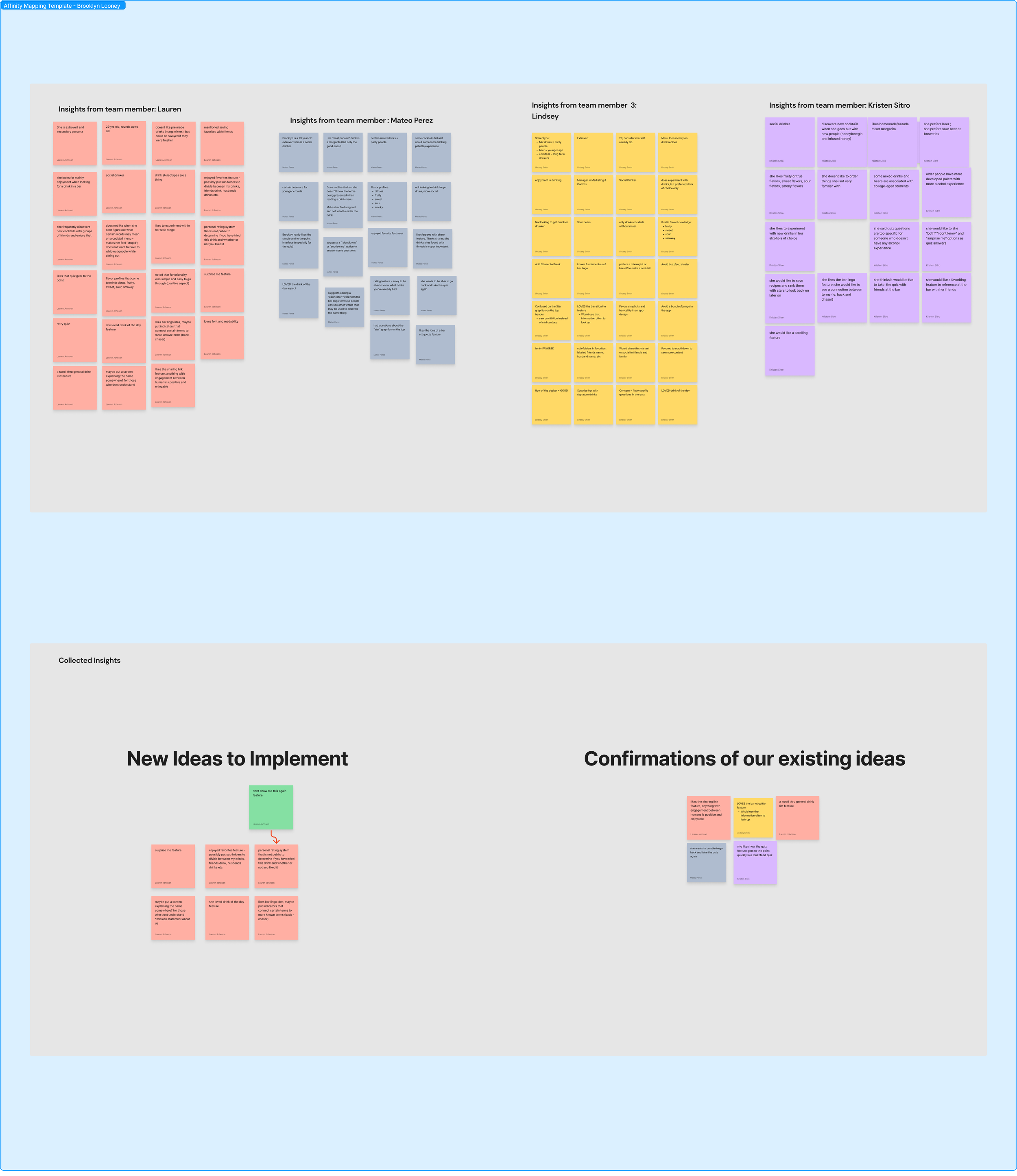 Our team conducted three interviews in Sprint Week 1. To prepare for these interviews, I wrote a rough interview script to follow before asking the participant to go through and explore our prototype. Each interview was held virtually and began by having the interviewee sign a consent form, and then we asked them the questions found in our script to give them a sense of what they will find in our MVP. From there, we then sent the link to the prototype and had the participant explore the app, providing feedback along the way. This allowed my team and I to discover two major patterns found in most of our interviews: ideas that confirmed our existing assumptions, and new ideas/goals the user gave us that we needed to implement. After each interview ended, my team and I then utilized affinity maps. These affinity maps allowed us to organize our notes from the interviews and pick out significant patterns from the data. This is where we started to recognize our two major patterns within our collected insights.