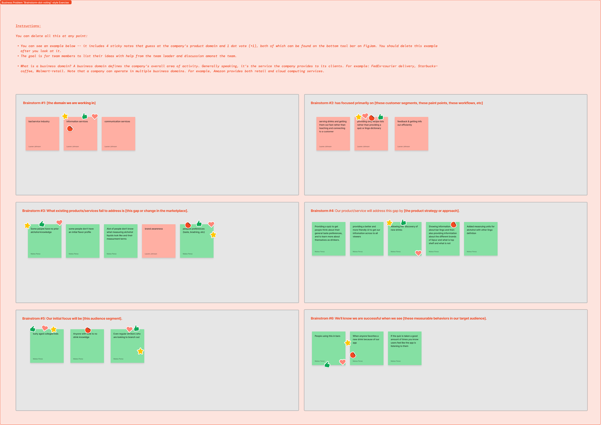 I established what I was hoping to see in the end product for Imbible to my team, and from there we started brainstorming for our business problem statement: a statement that contains the current goals of the product, what has changed in the world and how it has impacted the product, and a request to improve the product. This in turn helps the team focus on solving problems rather than implementing features.