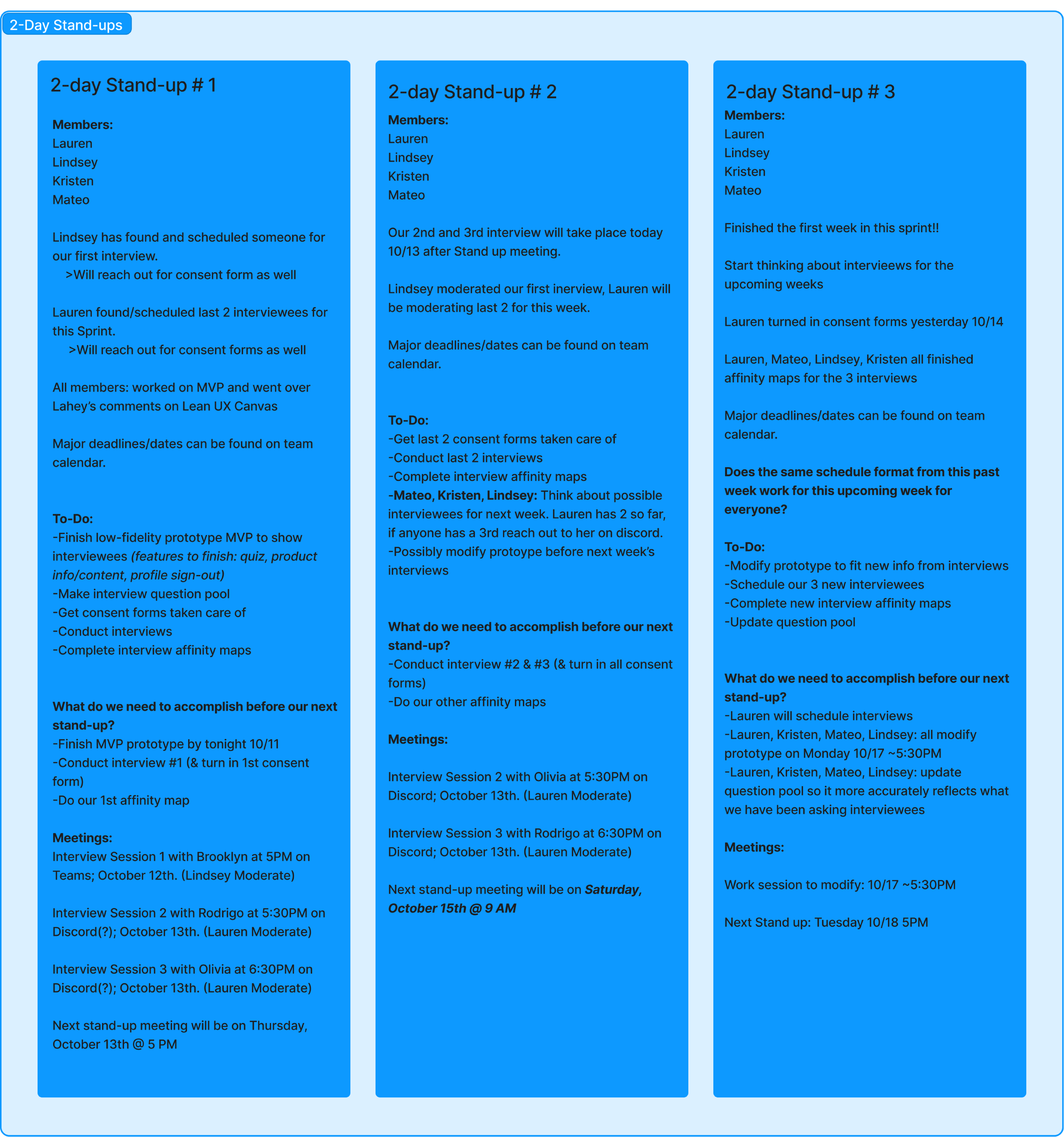 During Sprint Week 1, I conducted stand-up meetings with my team 3 times a week, with each meeting being around 15 minutes long. The purpose of these meetings was to keep everyone on the same page, remind the team of important dates, see what we have accomplished, and what is next for us. This is where we decided that our assumptions were valid, but we needed to implement other ideas in order to fully meet our users’ goals.