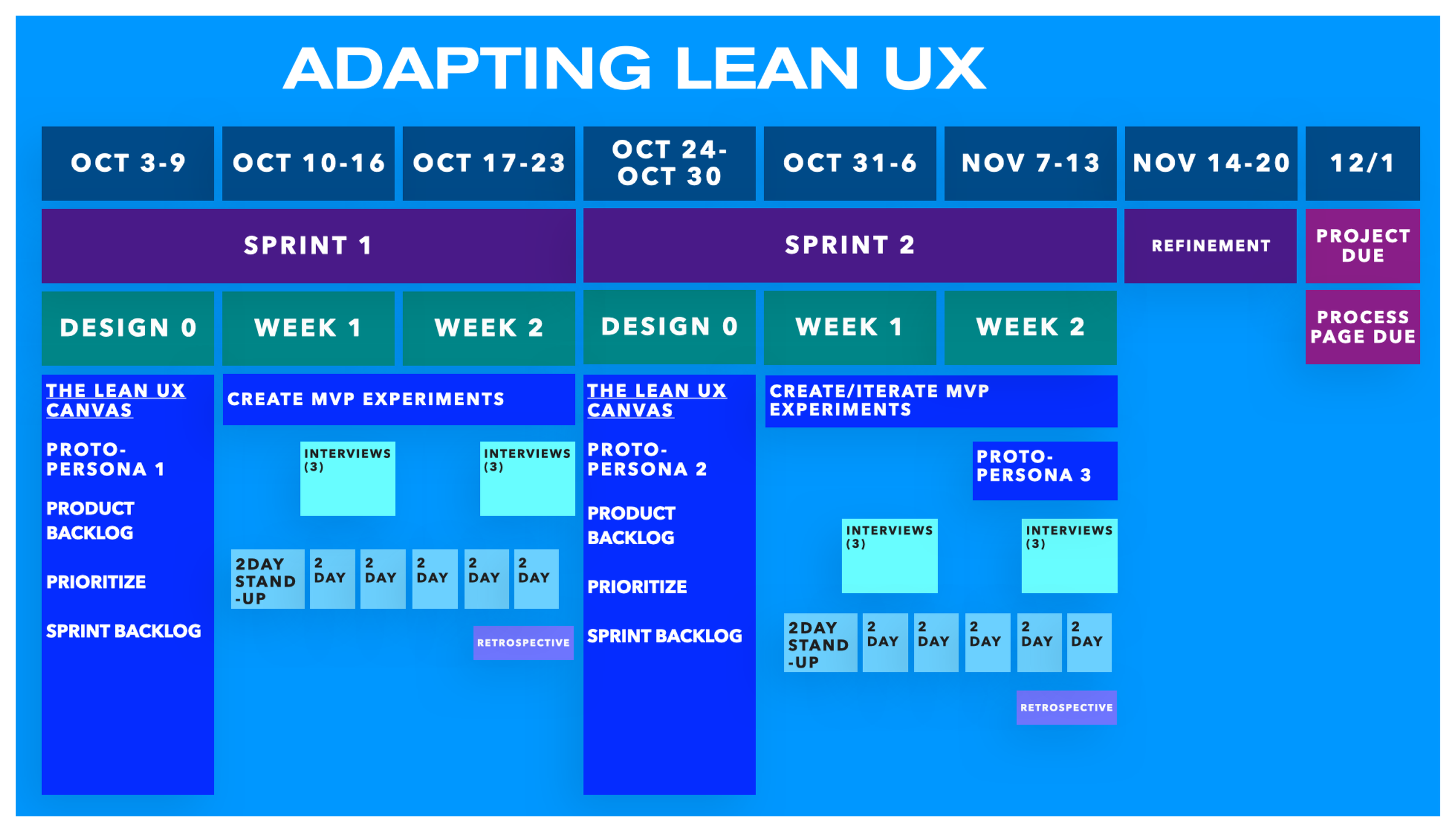 It is worth noting that the version of Lean UX we used was adapted by our professor to fit the timeframe and accessibility limitations of our course. Pictured is the schedule our class followed:
