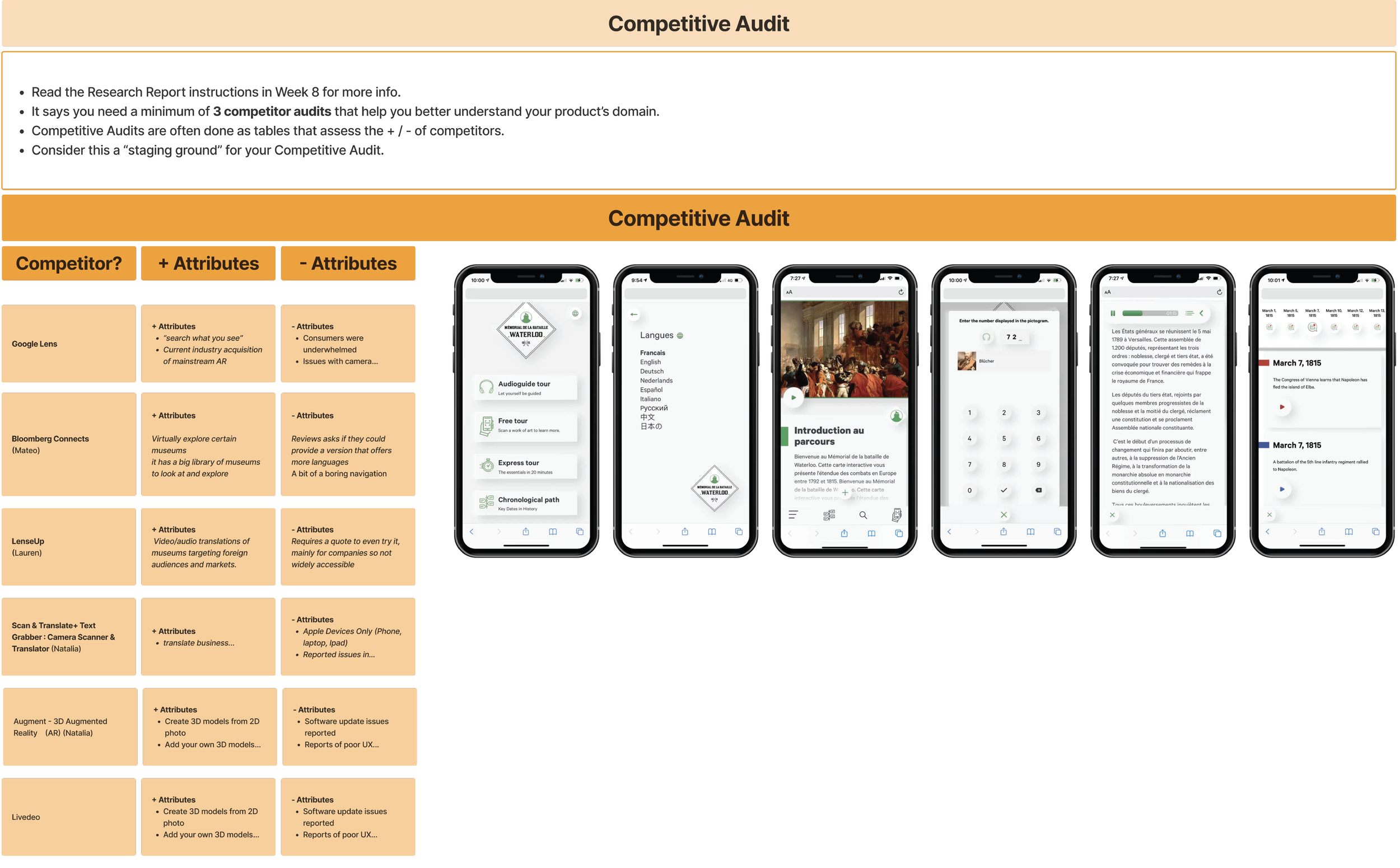 Competitive Audit. Conducting a competitive audit was a crucial step in our design process because it provided us with valuable insights into the strengths and weaknesses of competing apps in the market. This information enabled us to identify opportunities to differentiate our app and create a unique value proposition that meets users' needs more effectively. By analyzing our competitors' offerings, we were able to gain a better understanding of what our target audience wants and how we can deliver it to them in the best possible way. We researched 6 competitors - our findings are pictured below.